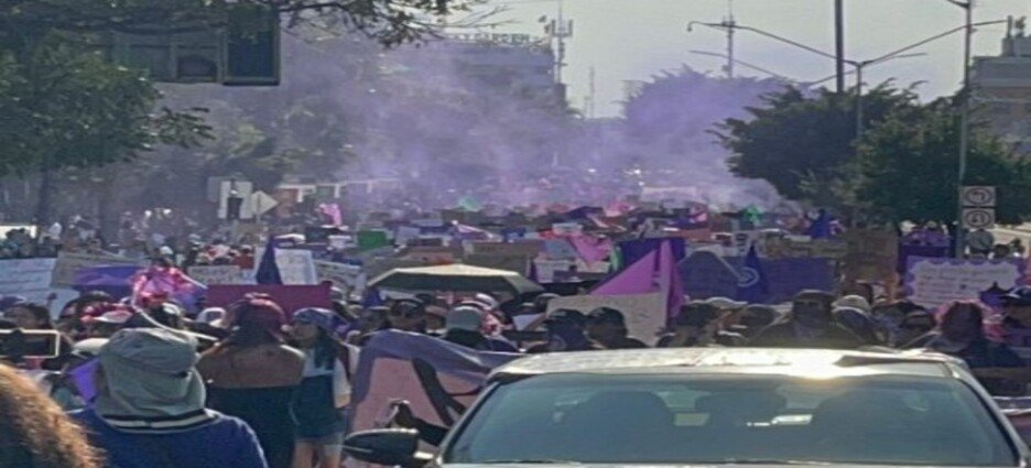El grupo avanzó junto a la movilización principal portando palos, bates, martillos, tubos y latas de aerosol, con los que realizaron diversas pintas en calles y paradas de transporte público durante el recorrido que inició en la Alameda Hidalgo y continuó por avenida Zaragoza hasta llegar al conocido Tanque de Agua donde pintaron consignas como “abusador”, “gobierno feminicida” y “ni una más”, entre otras.