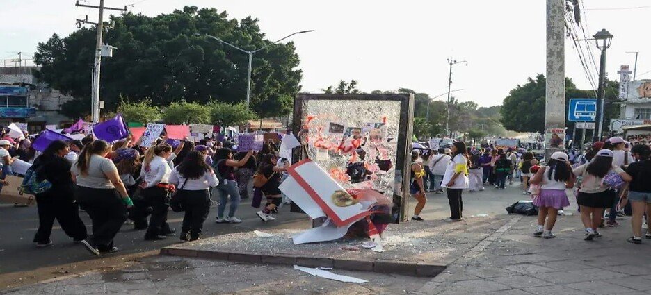 También se registraron pintas en las inmediaciones del banco Santander, sobre 16 de Septiembre, inmueble que previamente había sido cubierto con maderas para evitar daños durante el paso de la manifestación.